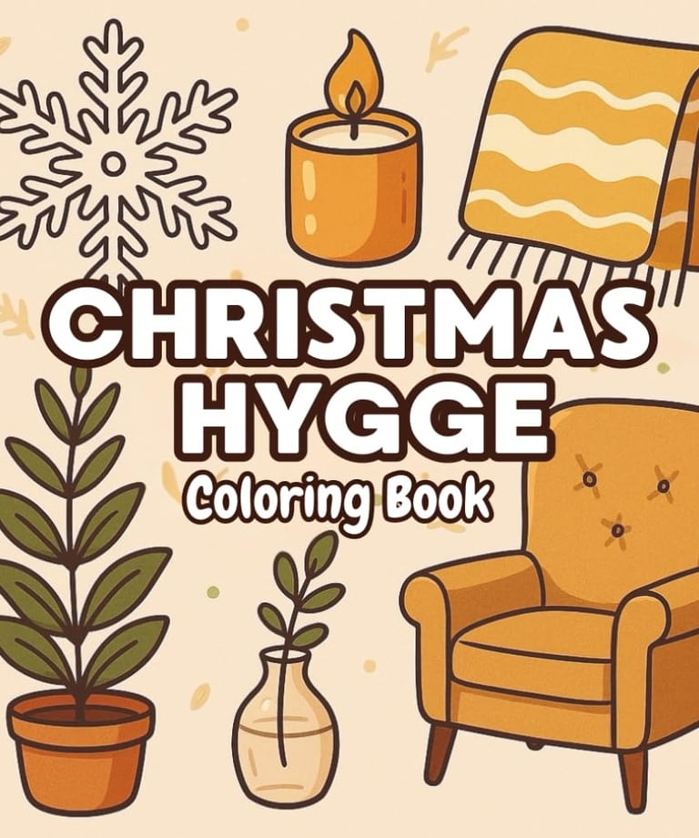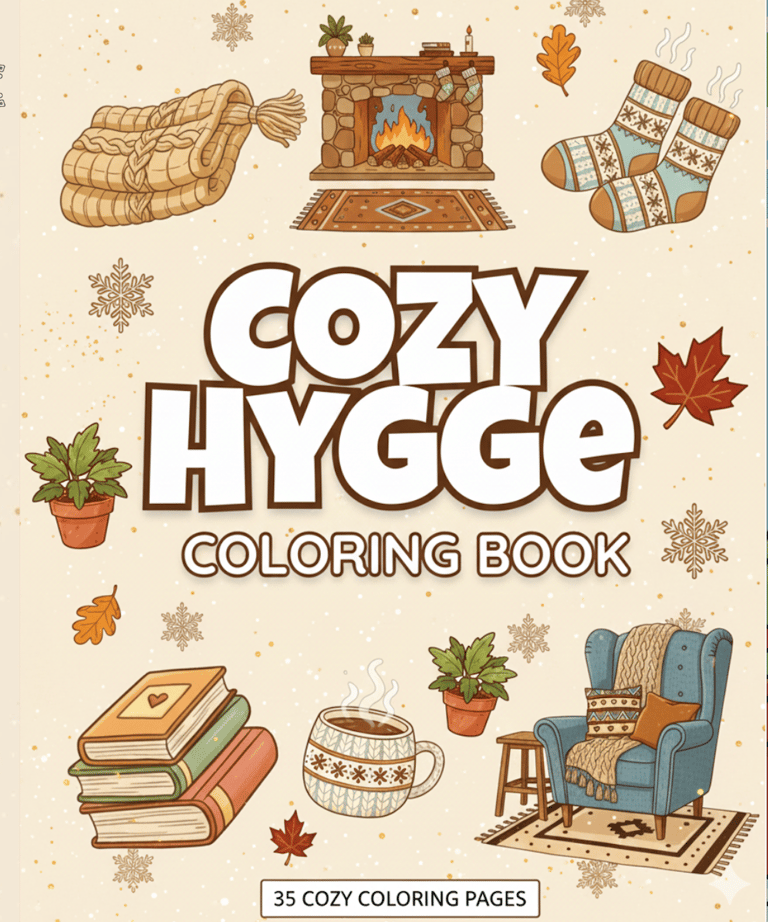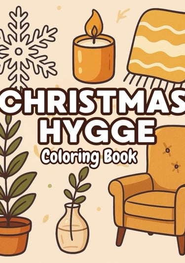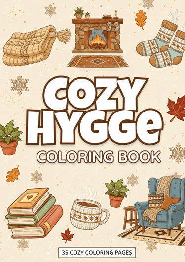 A calming hygge coloring escape filled with cozy scenes, warmth, comfort, and peaceful relaxation.