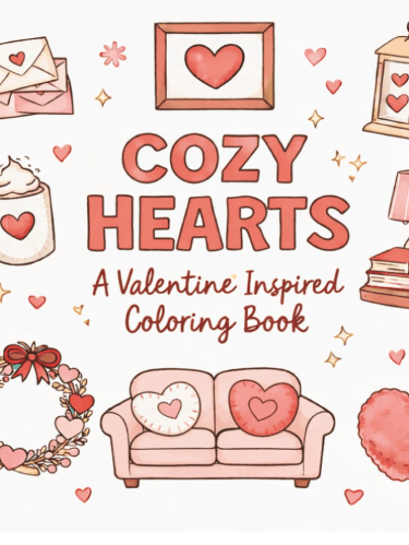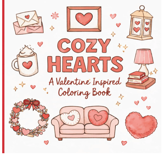 A Valentine Inspired Coloring Book brings you into a soft, peaceful world of love notes, heart pillows and gentle corners